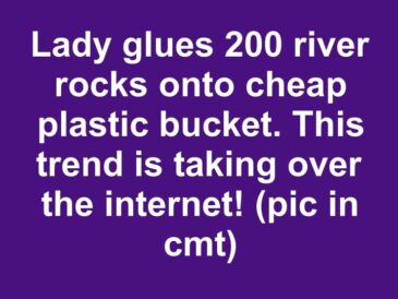 Creating a DIY faux stone planter by gluing river rocks onto a plastic bucket is …