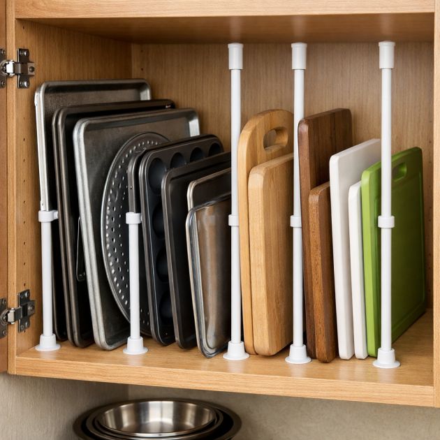 Keeping baking sheets, lids, and cutting boards organized can be a challenge. A tension rod can act as a vertical divider within a cabinet, allowing you to store these items upright and easily accessible. Install one or more tension rods vertically within a cabinet to create narrow slots that hold items like cutting boards and baking sheets. This method not only maximizes space but also prevents items from toppling over when you open the cabinet.