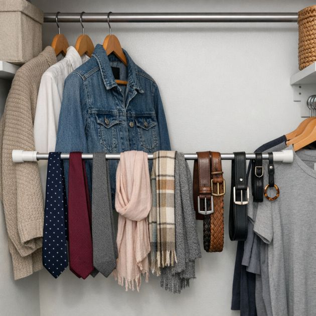 Closets often lack sufficient hanging space, especially for small items like scarves, ties, or belts. A tension rod can easily be added to any closet to create an additional tier for hanging. Simply position the rod parallel to the existing hanging bar, about 1 to 2 feet below. This setup is perfect for hanging shorter items or creating a dedicated section for accessories. It’s a flexible solution that can be adjusted as your storage needs change.