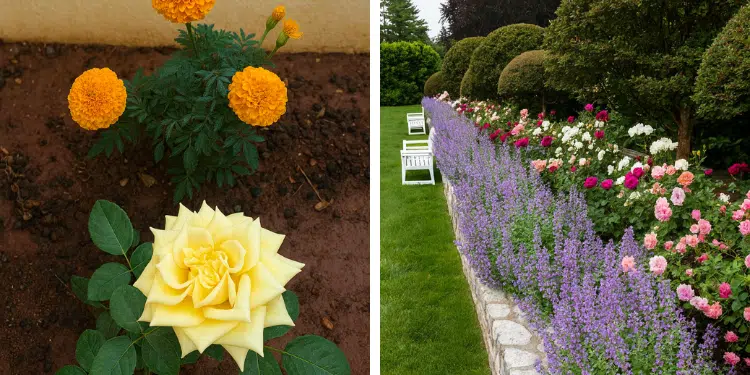 Marigolds planted at the base of roses help create a protective barrier without competing aggressively for nutrients.