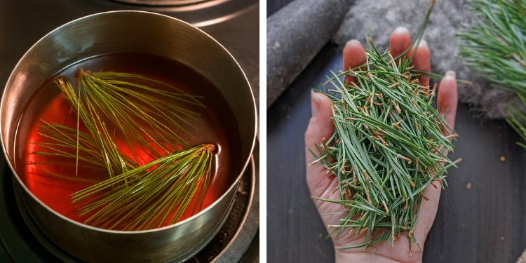 - Simmer 2 cups of pine needles in 4 cups of water for 30 minutes.