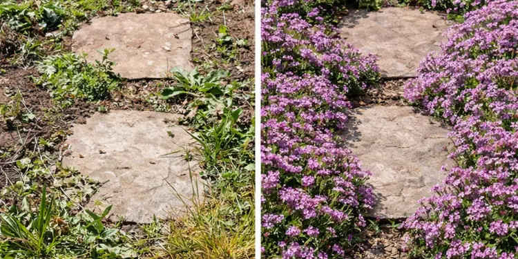 Creeping thyme is a low, aromatic groundcover that forms a dense, mat-like carpet. Its tiny leaves hug the soil so tightly that very little light reaches weed seeds below.