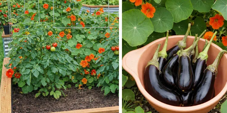 Eggplant shares pest pressures with peppers and tomatoes. Nasturtiums serve the same protective companion role here.