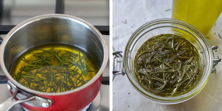 Once cooled, remove the rosemary and pour the infused oil into a glass jar or bottle.