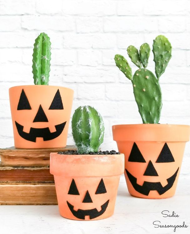 The following project from Sadie Seasongoods takes into account the holiday spirit. Prepare your front porch, doorway, or windowsill with these Halloween-chic clay pots.