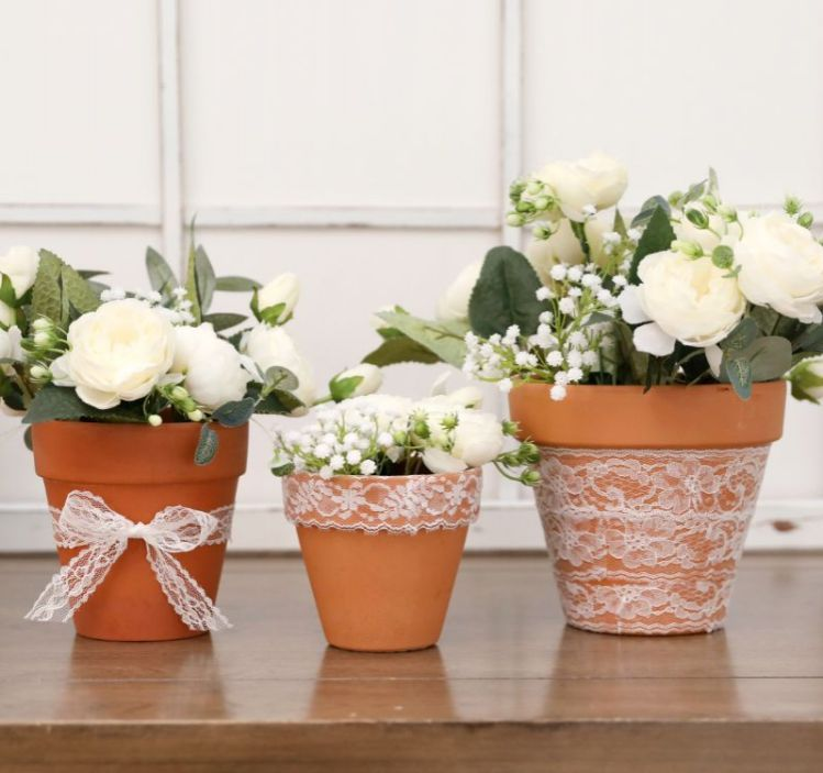 Terra-cotta pots are beautiful, versatile items that can be turned into almost anything. Still, their best feature is the way they make a lovely home for a bouquet of fresh or silk flowers. Adding lace to the pots create a chic, feminine touch to any space. Get the full tutorial here.