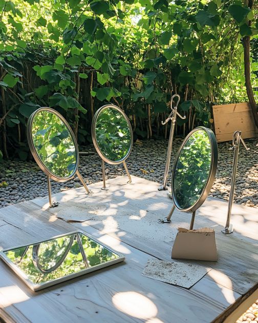 Consider adding plants or decorative elements around the mirrors to enhance the illusion and blend them into the garden.