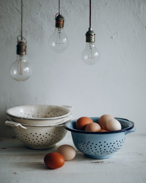 These colander pendant lights are perfect for kitchens or dining areas, especially in homes with rustic, farmhouse, or industrial themes. The enamel finish adds a splash of color and vintage appeal, while the perforations in the colanders create interesting light patterns on the walls and ceiling. Pair them with wooden or metal furniture for a cohesive look, and consider using Edison bulbs for a warm, vintage glow.
