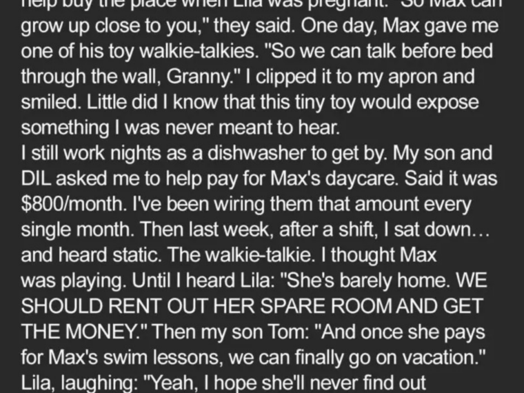 “No,” I answered evenly. “Your son gave me a gift. That walkie-talkie? It carried more than static. It carried the truth.”