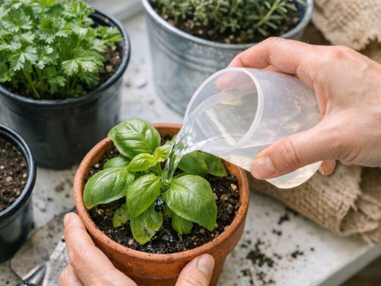 When applying the nutrient mixture to your herb pots, it’s crucial to do so gently to prevent soil disruption. Use a watering can with a fine nozzle or a spray bottle for smaller pots. Slowly pour or spray the mixture at the base of the plants, ensuring that the soil is evenly moist but not waterlogged.