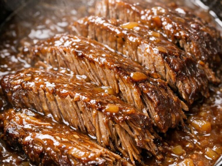 Stir the cooking liquid in the slow cooker thoroughly, scraping up any browned bits from the edges. The mixture should be a glossy, medium-thick brown gravy. If it seems too thin, turn the slow cooker to HIGH, leave the lid slightly ajar, and let it simmer for 10 to 15 minutes, stirring occasionally, until it thickens to your liking.