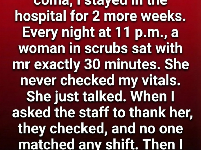 Each night, without fail, at exactly eleven o’clock, a woman dressed in medical scrubs appeared at my bedside. She never seemed hurried and never brought tools or charts. She didn’t examine screens or adjust wires. Instead, she sat beside me and spoke with the familiarity of someone who had known me for a lifetime. She shared gentle stories—about ordinary moments filled with quiet courage, about people who discovered strength only after believing they had none, about how help sometimes arrives in forms we don’t anticipate. Her voice carried a steady warmth, and whenever she was there, a feeling of safety settled over me.