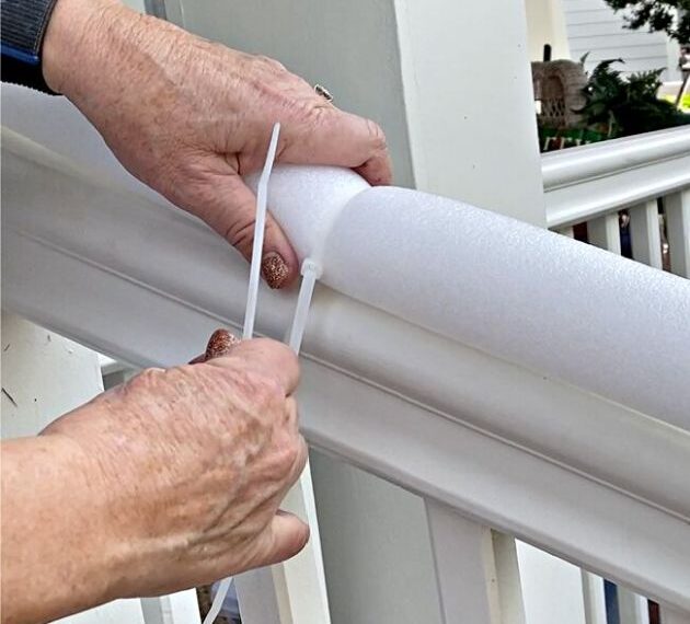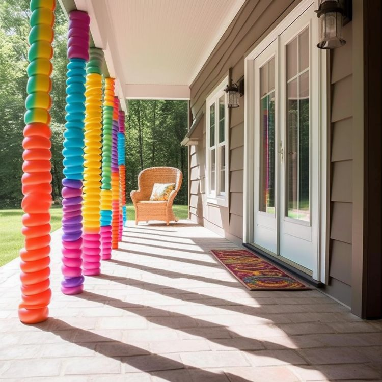 Elevate the look of your porch columns by wrapping them with pool noodles. Measure the height of your columns and cut pool noodles to fit. Use adhesive to attach the noodles vertically around the columns, creating a textured and colorful facade. This simple addition adds visual interest and a touch of whimsy to your porch.