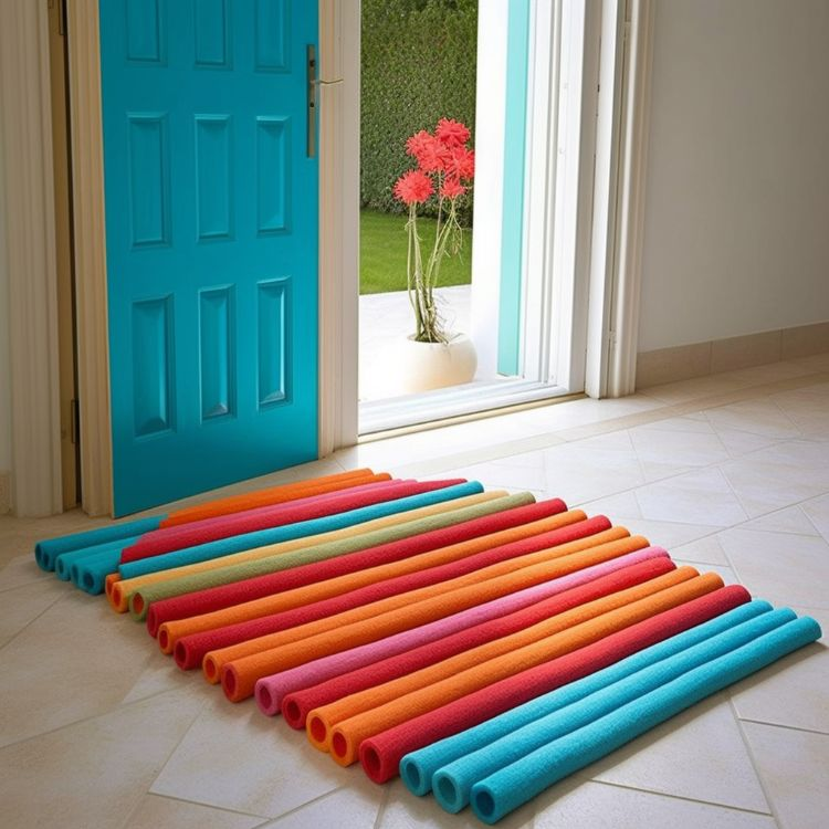 Create a soft and welcoming door mat using pool noodles. Cut the noodles lengthwise and lay them flat on a non-slip mat base. Arrange the pieces in a desired pattern, and secure them with glue. This cheerful door mat is not only eye-catching, but also provides a cushioned surface for wiping your feet.