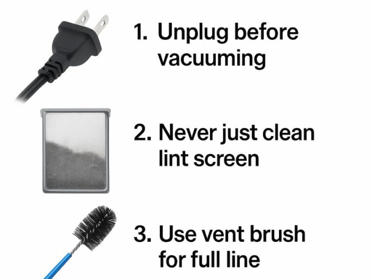 Once unplugged, you can proceed to vacuum around the lint trap and any visible areas where lint might accumulate. Using a vacuum with a hose attachment makes it easier to reach into tight spaces and remove more lint effectively.